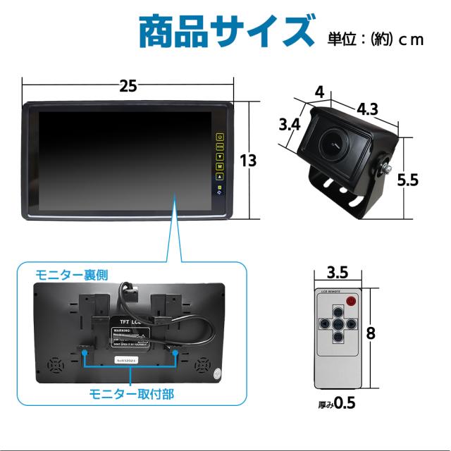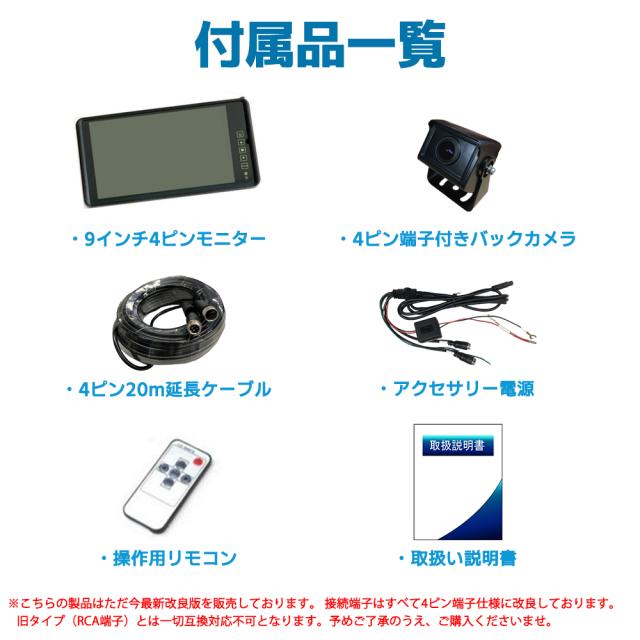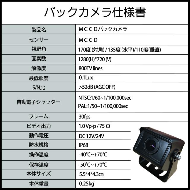 最新改良版を販売中 製品の接続端子はすべて4ピン接続端子仕様に改良しております。 バックカメラは延長ケーブル経由でモニター側から給電されます。(給電端子一本化) 旧タイプのようにバックカメラの電源を別途取る手間が省けます。 ※最新版のモニターはマルチメディア機能を廃止しております。 予めご了承のうえ、ご購入くださいませ。 ※旧タイプ(RCA端子)とは互換対応できないようになっておりますので、 予めご了承のうえ、ご購入くださいませ。 □高画質表示 □防水機能付き(最高等級/IP68) □拡光レンズ暗視機能 □広角:170度(対角) □ガイドラインon/off機能 ■製品仕様 センサー:MCCD 視野角:170度(対角)/135度(水平)/110度(垂直) 画素数:1280(H)*720 (V) 解像度:800TV lines 最低照度:0.1Lux S/N比:>52dB(AGC OFF) 自動電子シャッター: NTSC:1/60~1/100,000sec PAL:1/50~1/100,000sec フレーム:30fps ビデオ出力:1.0 Vp-p / 75 Ω 動作電圧:DC 12V/24V 防水規格:IP68 動作温度:-40℃~+70℃ 本体サイズ:約34×43×40(mm) 本体重量:約250g ■商品内容 9インチモニター本体 バックカメラ本体 4ピン延長ケーブル20メートル 日本語説明書 ※バックギア機能ご利用の場合、バックカメラをチャンネル2に 接続してご利用ください。 ※バックカメラ設置箇所付近に電波を発信する電子機器 (バックメロディーホンなど)がある場合、電子機器から 発生される電波の影響でバックカメラの内部基盤が破損する可能性が ございますので、その場合は電波が干渉しないように対策を 講じていただく必要がございます。 ※設置、使用方法でご不明な点などございましたら メールなどでお問い合わせいただけましたら ご説明もさせていただきます。 ご遠慮なくお問い合わせください。 |