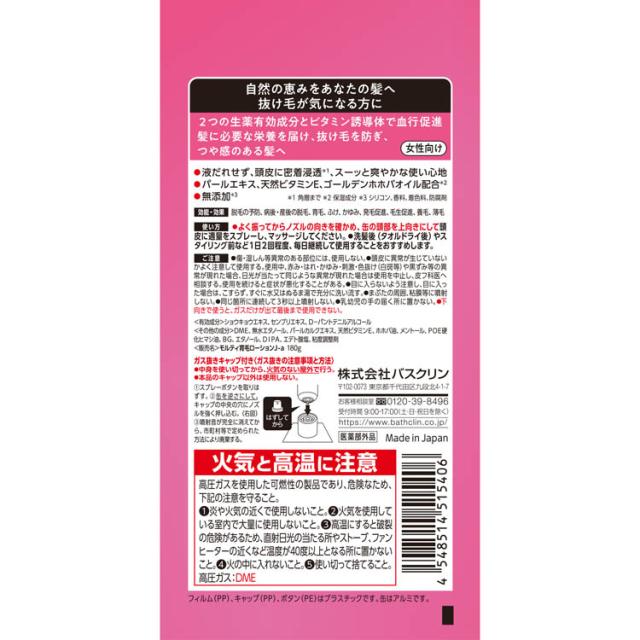 | (有効成分)ショウキョウエキス、センブリエキス、D-パントテニルアルコール (その他の成分)DME、無水エタノール、パールカルクエキス、天然ビタミンE、ホホバ油、メントール、POE硬化ヒマシ油、BG、エタノール、DIPA、エデト酸塩、粘度調整剤 |