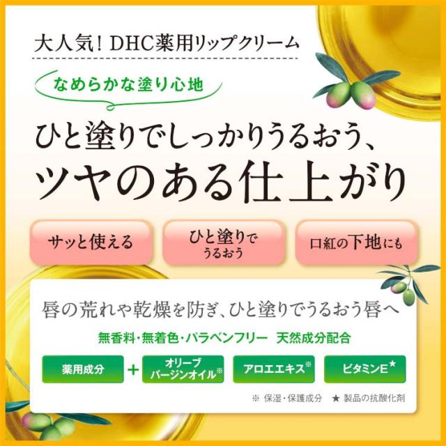 DHCは、唇の粘膜と似通った組成をもつ植物成分を追求し、豊富に配合。オリーブバージンオイル、アロエエキス、甘草誘導体などが、高い密着性と優れた保護・保湿作用を発揮します。驚くほどなめらかにのびてベタつきません。
