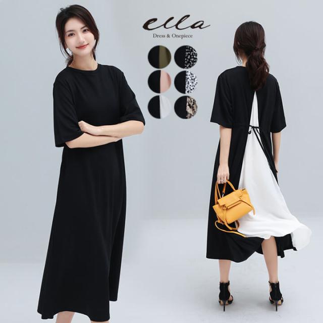 ワンピース レイヤード 異素材 シンプル クルーネック フィット感 バックスリット 20代 30代 40代 ミディアム 膝丈 エレガント 大人 ママ フォーマル レディース ブラック 黒 花柄 フラワー 葉柄 リーフ ネイビー 緑 グリーン ピンク ホワイト 白 袖あり 半袖 rt2138 F フリーサイズ