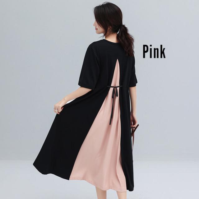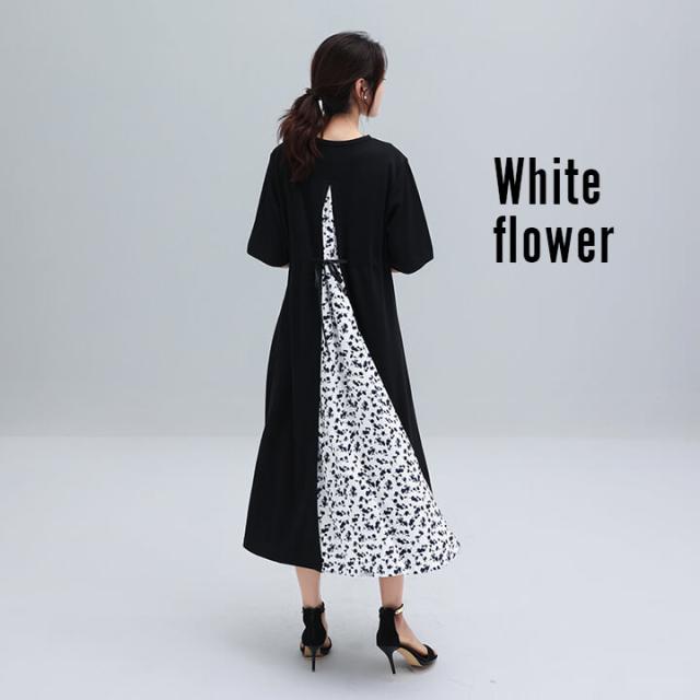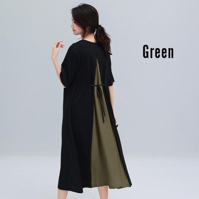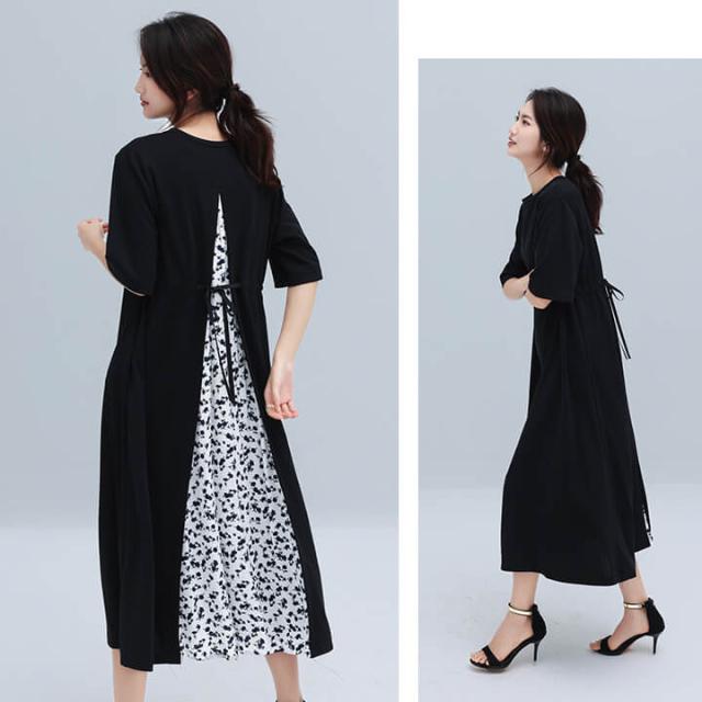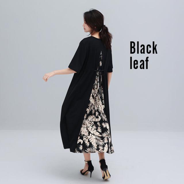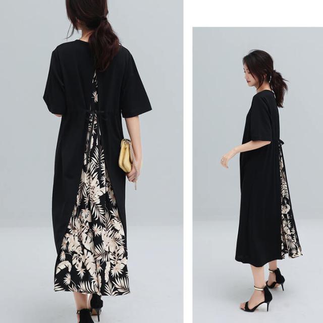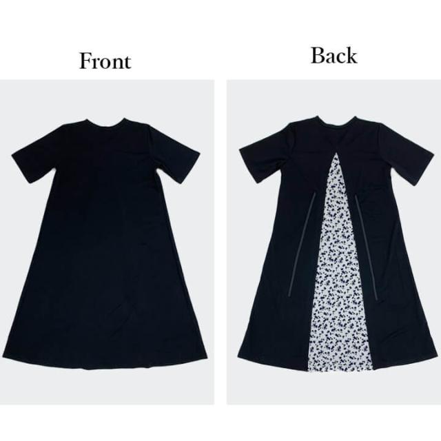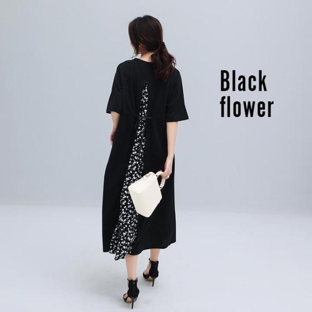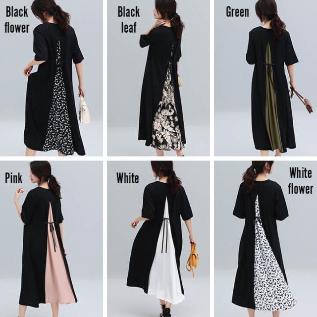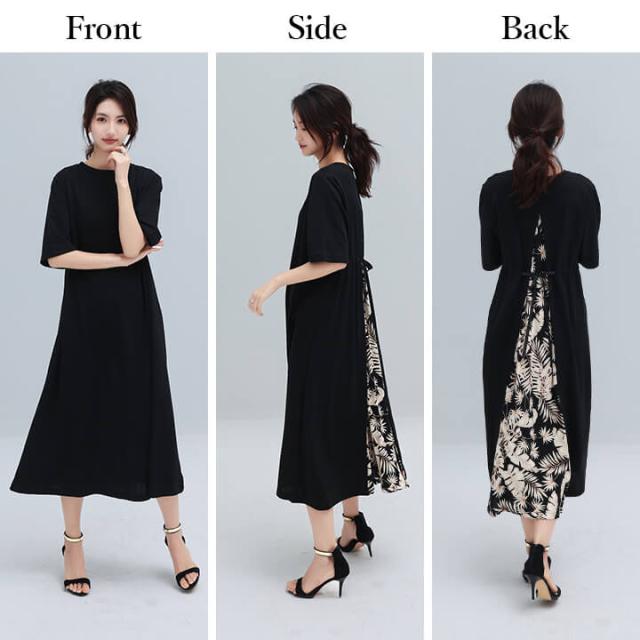 レイヤードワンピース 異素材 シンプル クルーネック 切替 バックスリット 20代 30代 40代 ミディアム 膝丈 エレガント 大人 レディース ブラック 黒 花柄 フラワー 葉柄 リーフ ネイビー 緑 グリーン ピンク ホワイト 白 袖あり 半袖 rt2138 F フリーサイズ