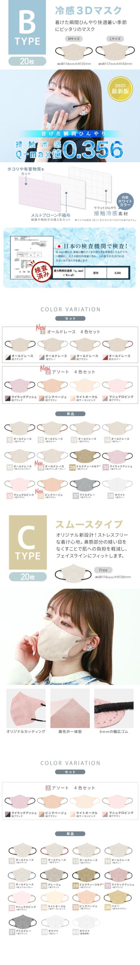| タイプ | Aタイプ:3D立体 オリジナル立体構造で程よい空間を保ちつつフェイスラインに隙間なくフィット Bタイプ:冷感3D立体 付けた瞬間にひんやり快適暑い季節にピッタリのマスク Cタイプ:スムースタイプ 鼻への摩擦を減らしストレスフリーな着け心地 Dタイプ:ワイヤーフィット 新設計のワイヤー入りで快適さとフィット感が抜群 |