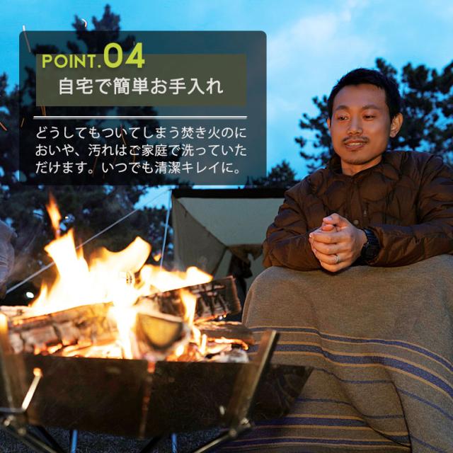 焚火やバーベキューの時に火の粉が飛んでも燃え広がりにくく、キャンプ、アウトドアにピッタリ。