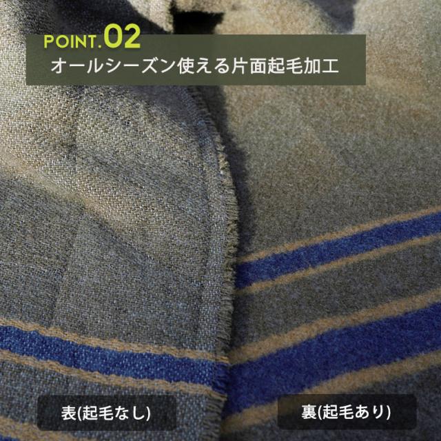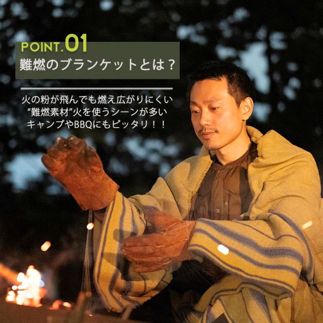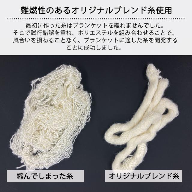 防護服などに使われる高難燃の繊維とポリエステルを組み合わせたオリジナルブレンド繊維を使用し、毛布の産地として名高い大阪・泉州地方の毛布職人が織り上げた難燃ブランケット。