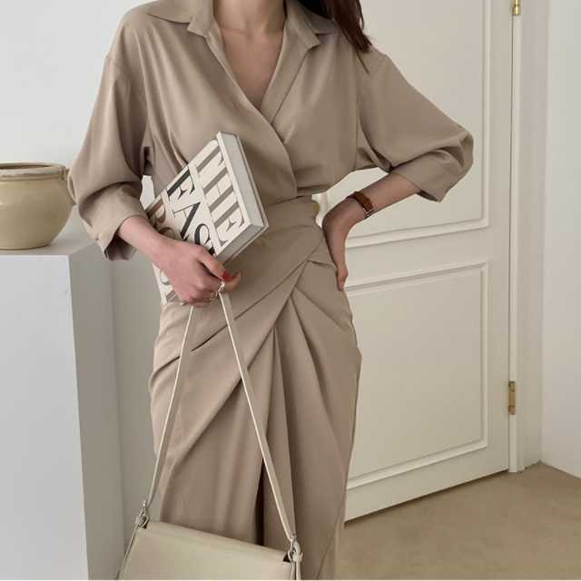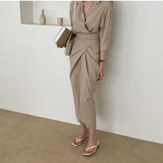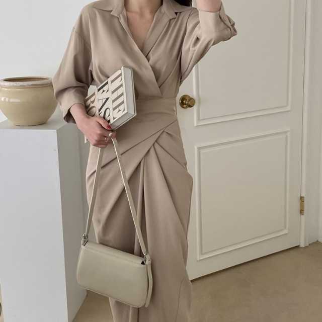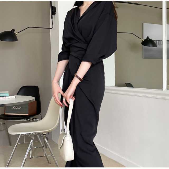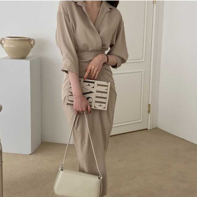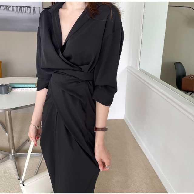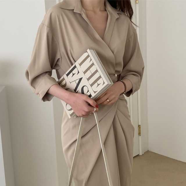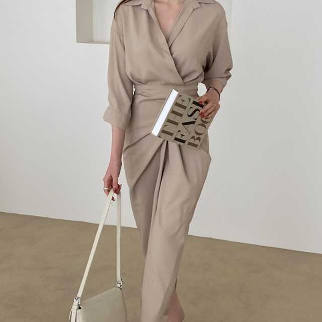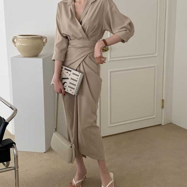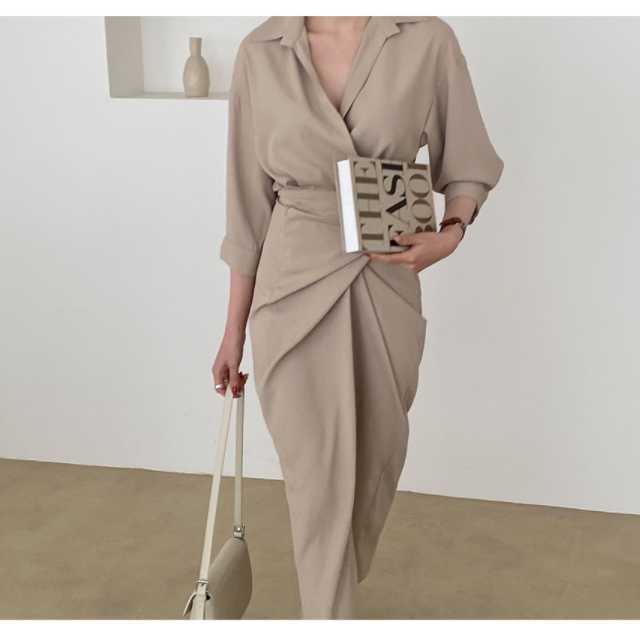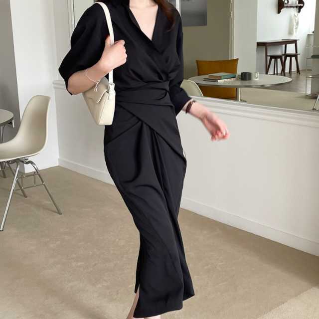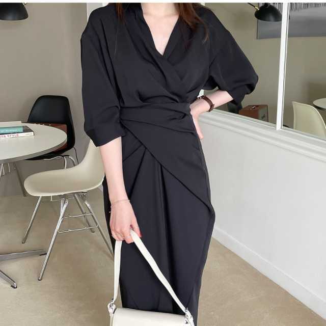 ワンピース カシュクールワンピース カシュクール レディース マキシ丈 ロング丈 五分袖 スタンドカラー Vネック シャツワンピ ウエストマーク 無地 きれいめ 大人ワンピ 春 夏 キレセク