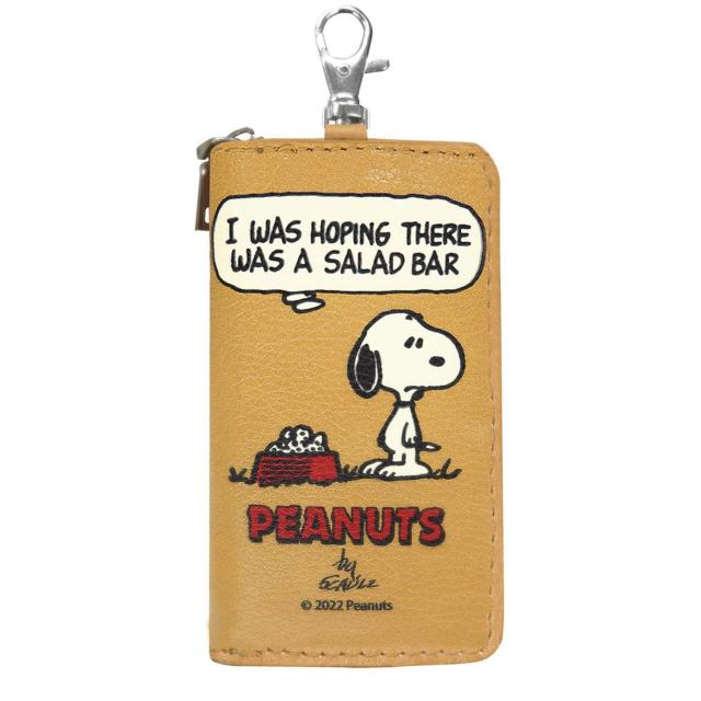 ヴィンテージ感のある絵柄が可愛い!キャラクタースマートキーケースに少し大きめLサイズが新登場。ファスナーは大きく開くラウンドタイプで、ラクラク開閉。ケース内部に自動車のスマートキー(キーレスキー)がちょうど収まるサイズ。内側のリングにスマートキーを取り付けることで、スマートキーの紛失や落下の防止に!ゴムバンドで小さめのスマートキーもしっかり安定。自宅の鍵や自転車の鍵をキーリングに取り付ければ、通常のキーケースにもなる便利仕様。右側のオープンポケットは、免許証やETCカードの収納にぴったり!360度回転するカラビナで、バッグの持ち手やショルダーベルト、パンツのベルトループに取り付け可能!シボ感のあるカラーフェイクレザーに描かれた、PEANUTSのレトロなイラストがワンポイント。