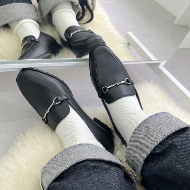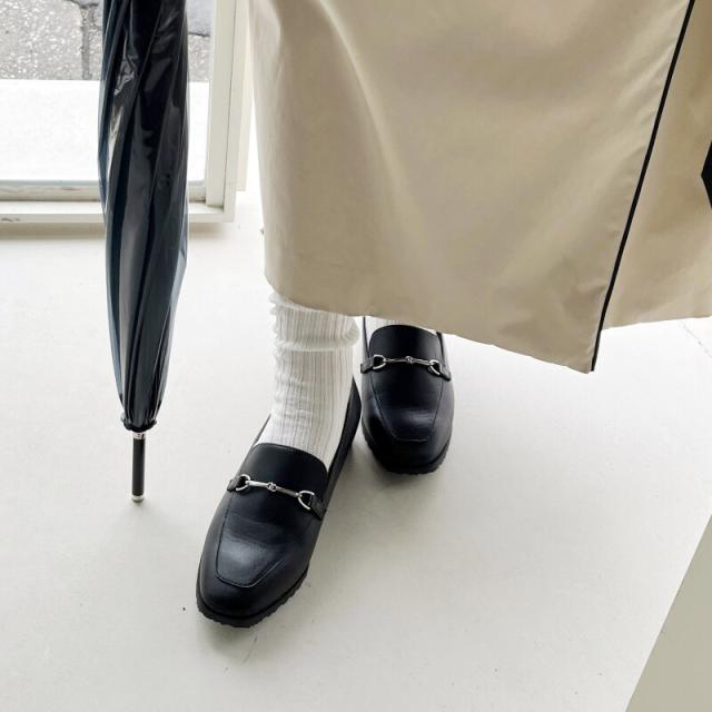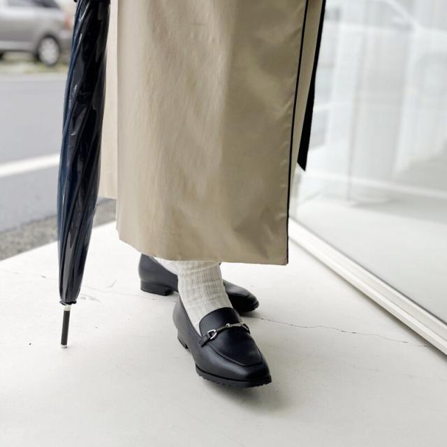 カジュアルに履けるローファーデザインのレインパンプスは、シルバーのビットモチーフがアクセント。