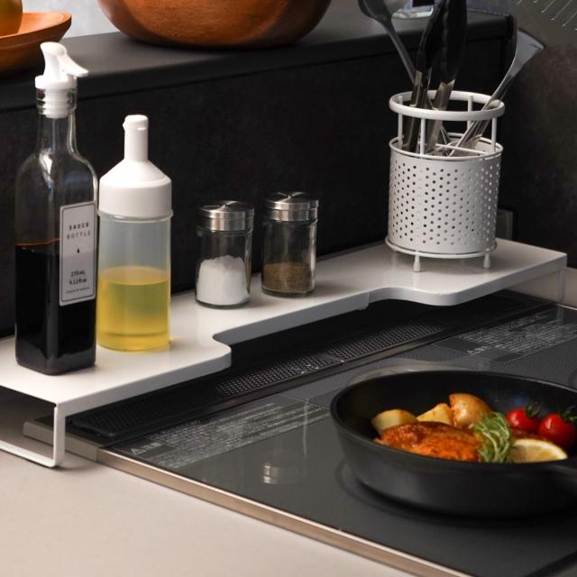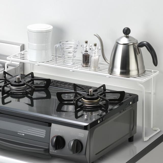 よく使う鍋やキッチン小物の収納や一時置きに便利なコンロ奥ラックです。幅は約63〜80cmまで伸縮するのでご家庭のコンロ幅やスペースに合わせて置くことができます。