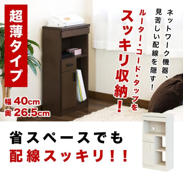 商品説明■2018年9月14日仕様変更●奥行き26.5cmになりました。●上部引き出しにA4サイズが入るようになりました。●天板にコードを通すスリットができました。●扉内の背板がなくなりました。コンパクトサイズなので、場所をとらず圧迫感がありません。上部引出はA4書類が収納でき、天板奥はコードを通すスペース、背面下部に巾木よけ(約高さ8cm)があります。下部は背板のないオープン仕様ですので、光電話の機器やルーターを収納したときに配線がスムーズです。コード穴付き 収納 キャビネット 収納棚 スリム コンパクト おしゃれなキャビネット コード穴付きキャビネット 玄関収納 スリム 省スペース おしゃれ 収納家具 おしゃれ 収納 扉付き 家の鍵や消毒液などを置く玄関収納 収納 玄関キャビネット 幅40 玄関収納 スリム 省スペース おしゃれ 収納家具 ナチュラル 北欧 寝室 コンパクト 引出し 扉付きで背面にはコード穴あり 隙間収納 隙間ラック 収納 コンパクト 奥行25cmから奥行30cmの家具をお探しの方に 配線穴 コード穴付きリビングキャビネット ベッドサイドに収納テーブル 配線収納ルーター収納40 FAX1台分ピッタリの大きさ 必要最低限コンパクト設計のラック ベッドやソファ横にランプや本などを置いても使える省スペースラック 玄関キャビネット キャビネット 幅40 玄関収納 スリム 省スペース おしゃれ 収納家具 ナチュラル 北欧 寝室