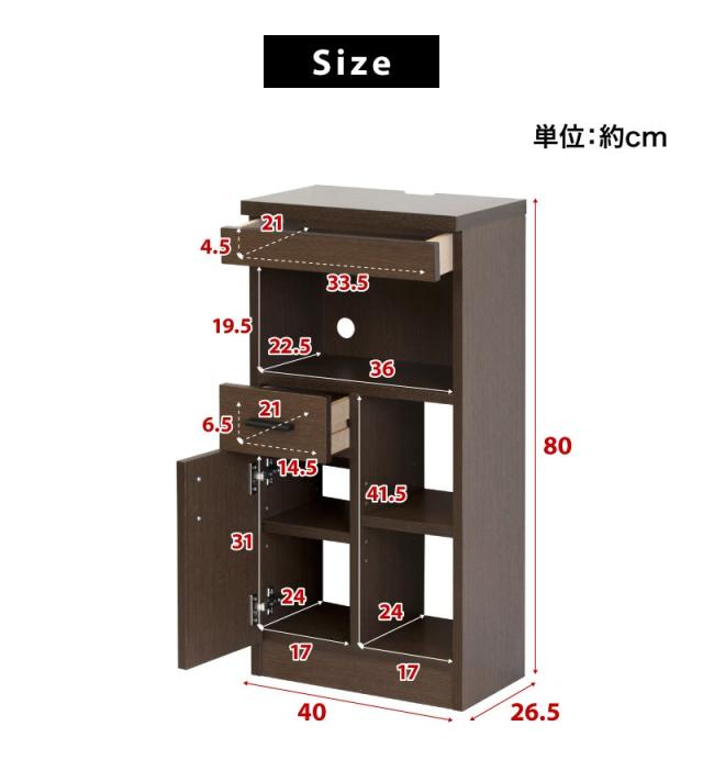 | 引出内寸(上部):約幅33.5cm×奥行き21cm×高さ4.5cm 引出内寸(下部):約幅14.5cm×奥行き21cm×高さ6.5cm 空間内寸(上部):約幅36cm×奥行き22.5cm×高さ19.5cm 空間内寸(下部):約幅17cm×奥行き24cm×高さ41.5cm 扉内寸:約幅17cm×奥行き24cm×高さ31cm 背面コード穴(空間上部)直径:約3.5cm |