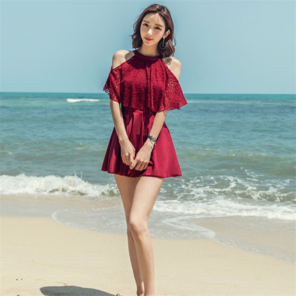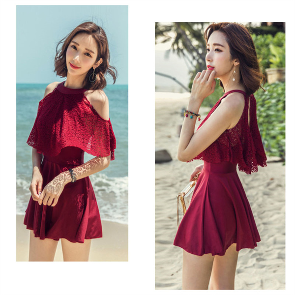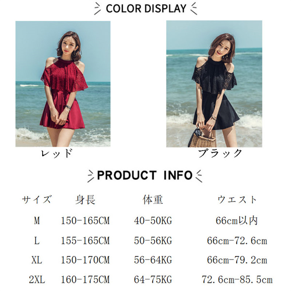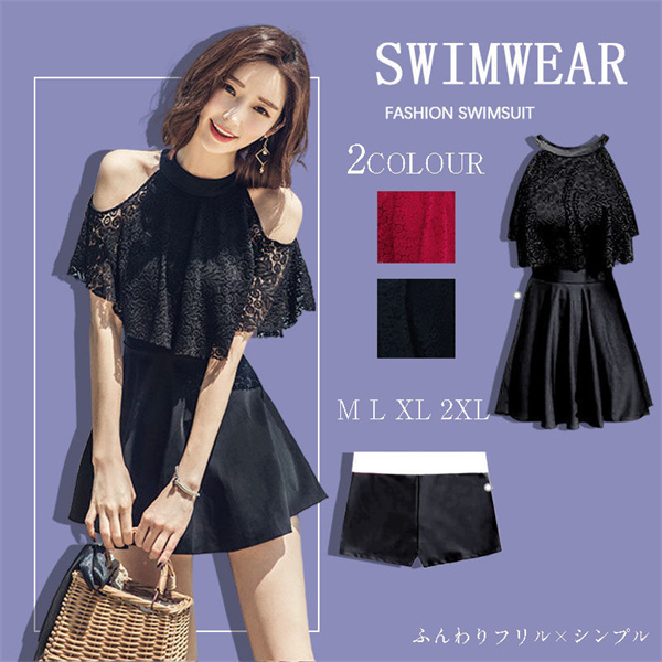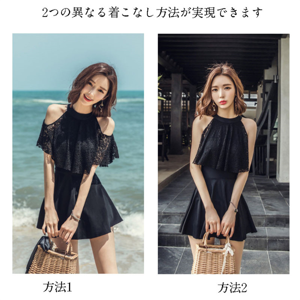 上品なレース2wayオフショルワンピ♪後ろは背筋を可憐に魅せる! 水着体型カバー オフショルワンピ オールインワン水着 ワイヤーあり ホルターネック かわいい お洒落 華奢 見せ 黒