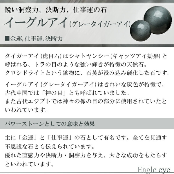 イーグルアイ(グレータイガーアイ)は全てを見通す、不思議な石と伝えられています。 優れた直感力や決断力・洞察力を与え、大きな成功をもたらすといわれています。