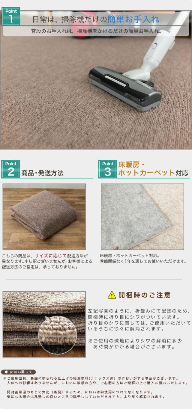 | 【こちらの商品の梱包方法】 ・折り畳み ※商品によりサイズに多少の誤差があります。 ※カラーはディスプレイ上、実際の色と多少異なる場合がございます。 ※商品は開梱時、ラグマット、カーペットの毛並みにムラなどがございますが、使用するにつれ、なくなります。 ※カーペットの製法上、表示サイズより0〜3%の誤差がございます。 ※こちらの商品は気になる遊び毛などは出にくいつくりとなっております。 ※滑りやすい場所でのご使用は市販のカーペット用の滑り止めネットのご使用をお勧めします。 ※汚れた場合は、カーペットクリーナー、中性洗剤などを薄め固く絞ったタオルなどで拭き取ってください。 | |