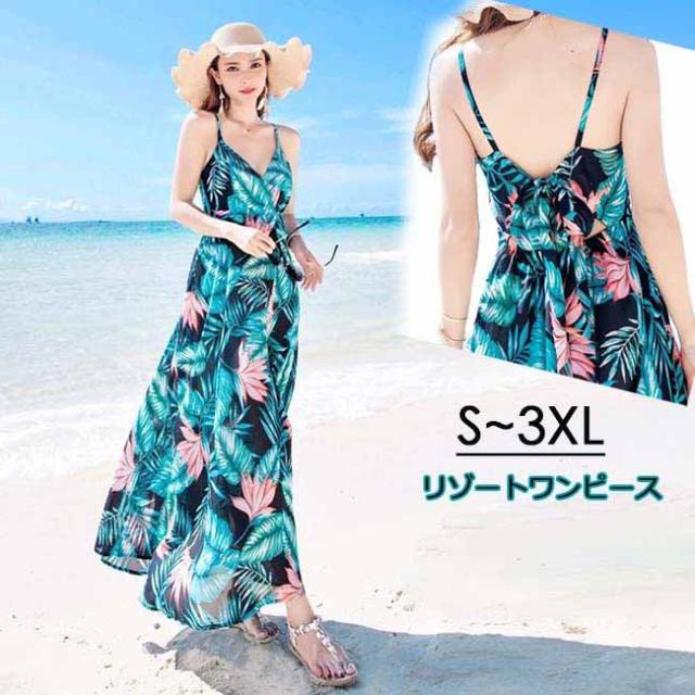 リゾート ワンピース マキシワンピース ロングワンピース 夏 海 休み 旅行 セクシー グリーン キャミワンピース レースアップ ノースリーブ 花柄 背中開き おしゃれ 背中見せ きれいめ
