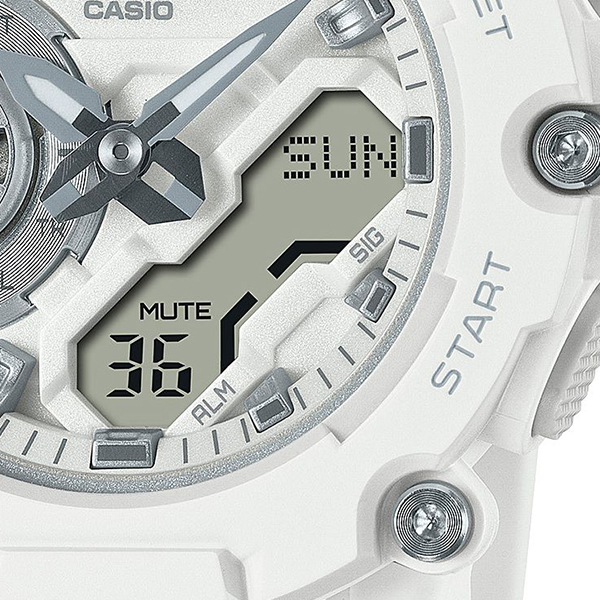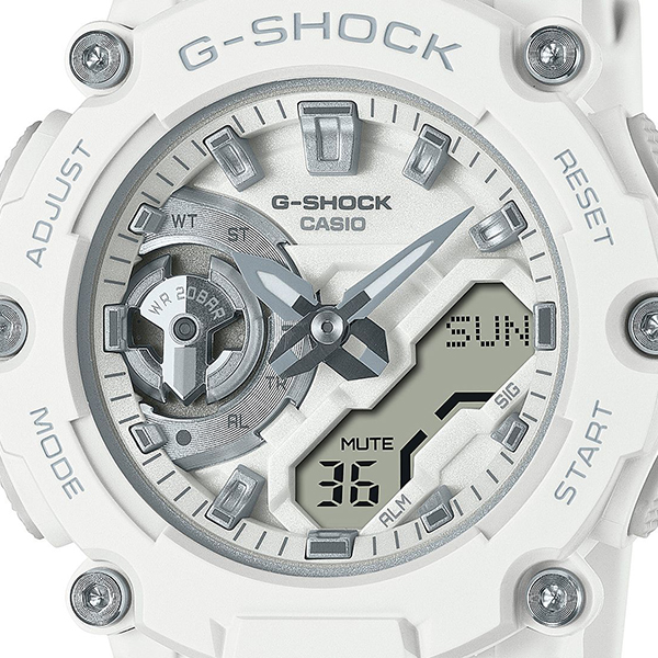 アーバンアウトドアをコンセプトに、どんなファッションにもスタイリングしやすいワントーンのニュアンスカラーを採用。9時側のインダイアルにはメタル蒸着処理を施し、カジュアルな中にもメタルのアクセントで上質さを加えました(S2200Mのみ)。ファッショントレンドを押さえたユースカルチャーにぴったりの小ぶりなG-SHOCKです。