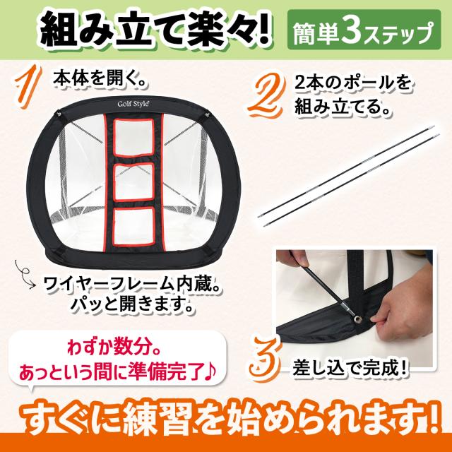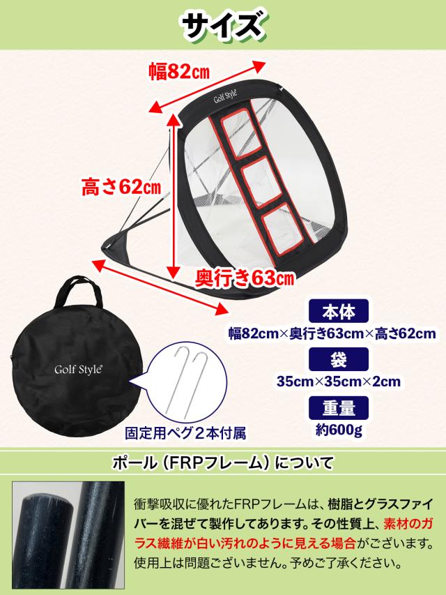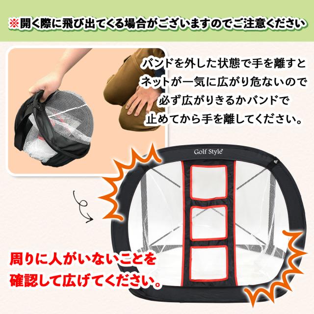 【安定感抜群のアプローチネット】ボールをたくさん入れても倒れにくい構造で、効率的に練習ができます。的から外れてしまっても大きなサイドネットがボールの散乱を防ぎます。