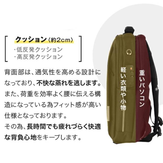 【人間工学に基づいた背面デザイン】人間工学を考慮したショルダーストラップで肩に負担がかかりにくく、負荷を軽減。背面部分は通気性を高める設計を採用し、不快な蒸れを効果的に逃します。荷重を効率良く腰に伝える構造になっているためフィット感も高く、長時間背負うときも疲れづらく快適な背負心地を保ちます。