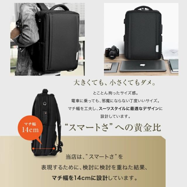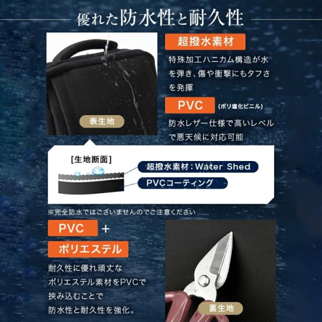 【”スマートさ”への黄金比】"スマートさ"を表現するために、検討に検討を重ねた結果、マチ幅を14cmに設計しています。 【優れた防水性と耐久性】超撥水素材とPVCコーディングの2重の断面になっているため、水を弾きます。