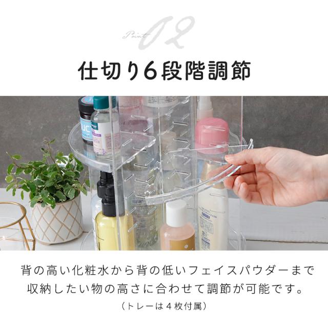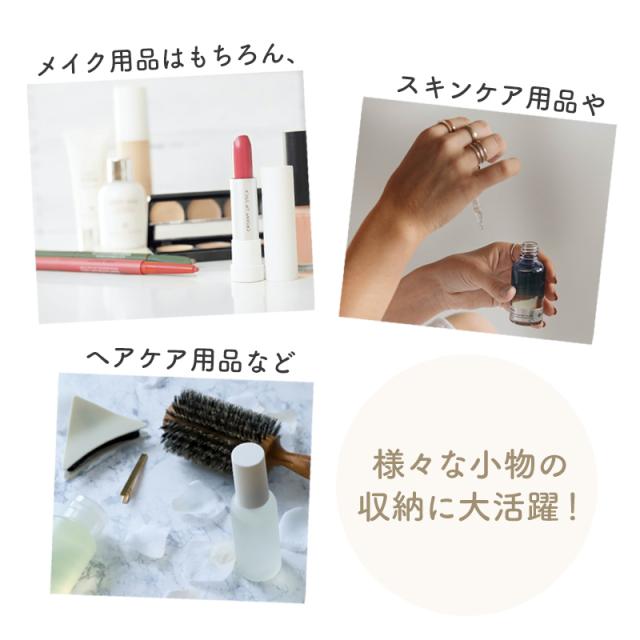 ●トレイの高さを調節できるので、背の高い化粧水からリップやマニュキア、ピアスやネックレスなどのアクセサリーまで幅広く収納。