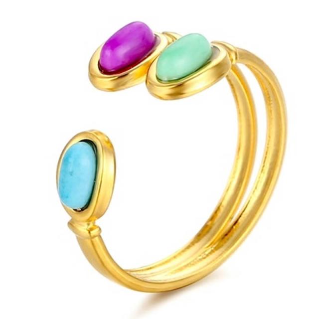 金色にゴールドメッキしたステンレスリングのトップに水色ブルーと紫色パープルと緑色グリーンの石を3つセットしたカラフルなステンレス製の指輪。