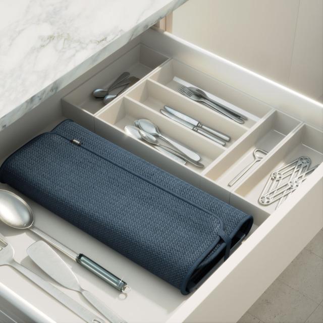 ディッシュラックは、干したい物の大きさや置く場所に合わせて、マットの真ん中や端などお好きな位置に動かすことができます。また、カトラリーや包丁などの細長い物も干せます。