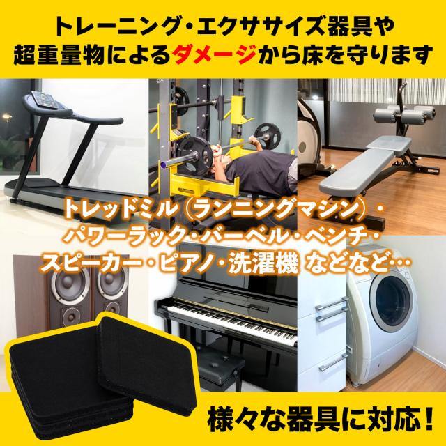 トレッドミルなどのトレーニング器具やピアノなど重たいものから床を守る高硬度マット!コンパクトサイズだから場所を選ばず簡単設置で防振・防音・防傷対策ができます。