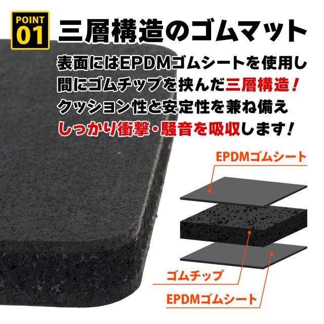 【優れた防振・防音】EPDMゴムシートの間にゴムチップを挟んだ三層構造による抜群のクッション性で、しっかりと衝撃・騒音を吸収しダメージから床を守ります。