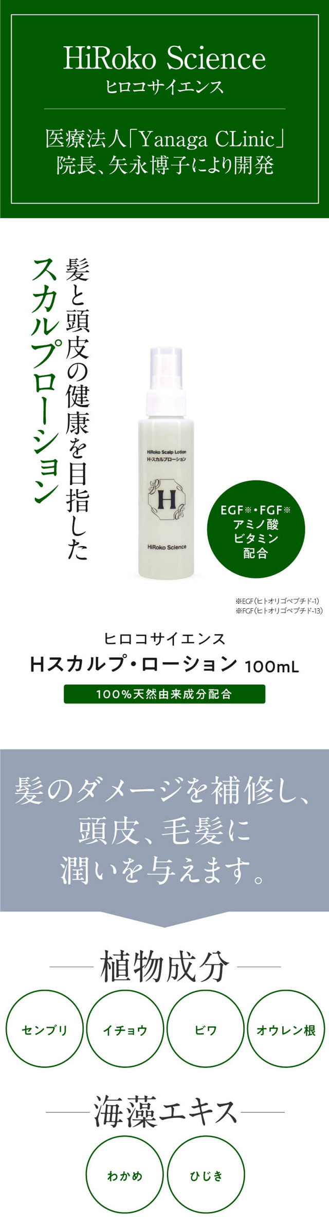 | 特徴 | 医療法人「Yanaga CLinic 」院長、矢永博子により開発。 ▼ヒロコスカルプシャンプ 髪のダメージを補修し、髪と頭皮の健康を目指したアミノ酸洗浄剤使用のシャンプーです。 EGF(ヒトオリゴペプチド-1)、FGF(ヒトオリゴペプチド-13)他、アミノ酸、ビタミンなどの成分を配合。(※1) 少量で絹のようなクリーミーな泡立ちなのに泡切れすっきり。 フケ、カユミをとり、頭皮、頭髪に潤いを与えます。 また、毛髪にハリとこしを与え、髪型を整えやすく、保持しやすくします。 リンスもトリートメントも、コンディショナーも不要。 これ1本でOKのシンプルケアです。 ※パサつきが気になる方はお手持ちのヘアオイルやトリートメントの使用推奨 ※ノンシリコン・無香料・無着色・無鉱物油 ※1:補修・保湿成分 ▼Hスカルプローション 髪のダメージを補修し、髪と頭皮の健康を目指したローションです。 EGF(ヒトオリゴペプチド-1)、FGF(ヒトオリゴペプチド-13)、植物成分(センブリ、イチョウ、ビワ、オウレン根)、海藻エキス(わかめ、ひじき)他、アミノ酸、ビタミンなどの成分を配合。(※1) また、潤い成分(オリーブ果実油、ホホバ種子油、亜麻仁油、コメヌカ油)をたっぷり配合しました。 これらの成分が髪のダメージを補修し、頭皮、頭髪に潤いを与えます。 また、毛髪にハリとこしを与え、髪型を整えやすく、保持しやすくします。 ※ノンシリコン・無香料・無着色・無鉱物油 ※1:補修・保湿成分 |