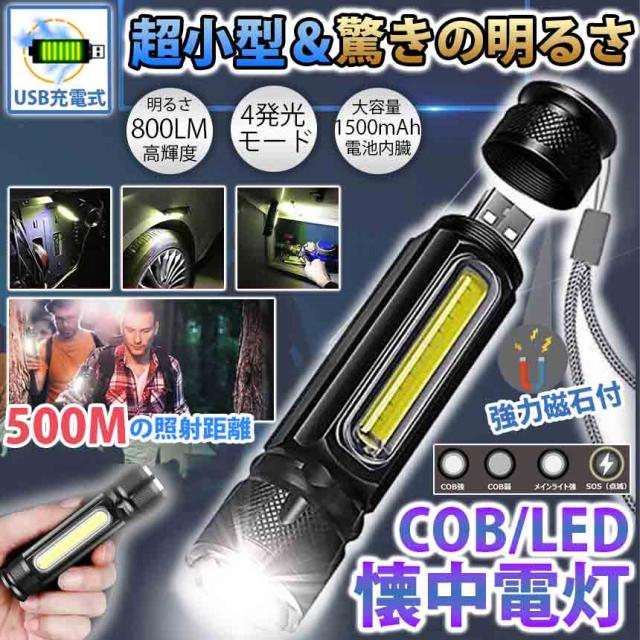 懐中電灯 LED COB USB充電式 ワークライト 磁石 ハンディライト 強力 小型 小さい 防災 T6 アウトドア キャンプ アルミ合金 軽量