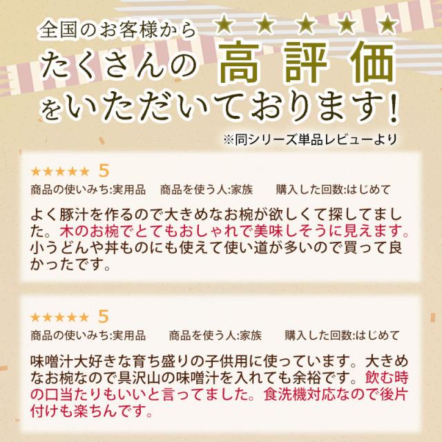 | 商品説明 | 手になじむ天然木の温もり。気品あふれる木製の大きめのお椀です。 当店の大変ご好評いただいております大汁椀のお得な10客セットです。 来客用や飲食店など業務用のまとめ買いにおすすめです。 伝統的な和のテイストを大切にしつつ、モダンな食卓にもマッチします。 木製のうるしのお椀と聞くと、なんとなく敷居が高い様に思われていませんか? いつものお茶わんのかわりに、ご飯をよそってもらったり、お味噌汁をよそってもらったり、実は普通に使えるものなんです。 木でできているので、見た目より軽く感じられ、手触りや、唇の口当たりが優しいのが特徴です。 また、木製のお椀は熱伝導率が低いので冷めにくく、最後まで温かいまま、召し上がる事ができます。 独特の木の感触も楽しめ、普段の食事も上質なものになります。 |