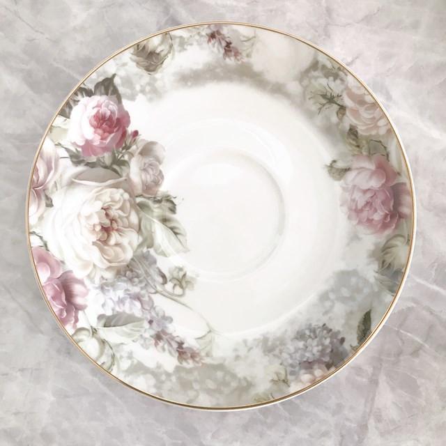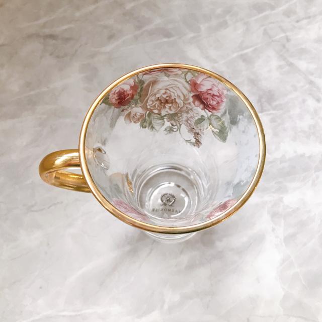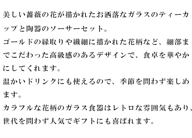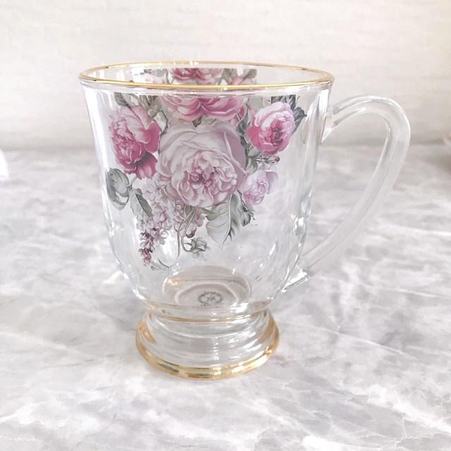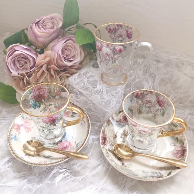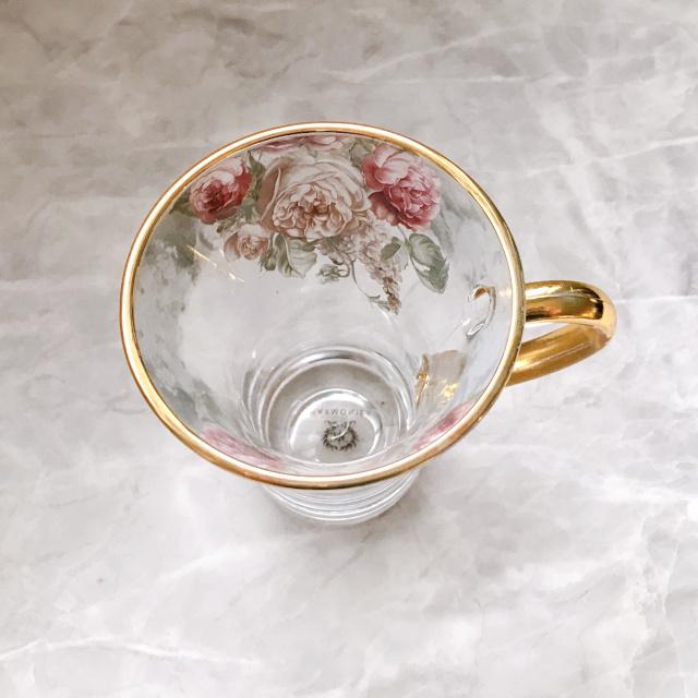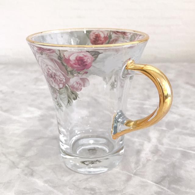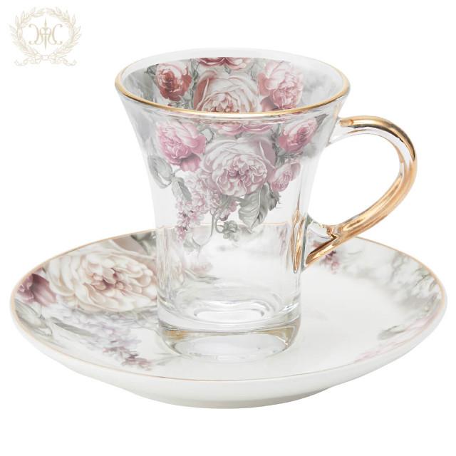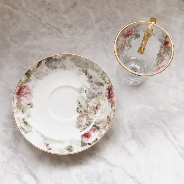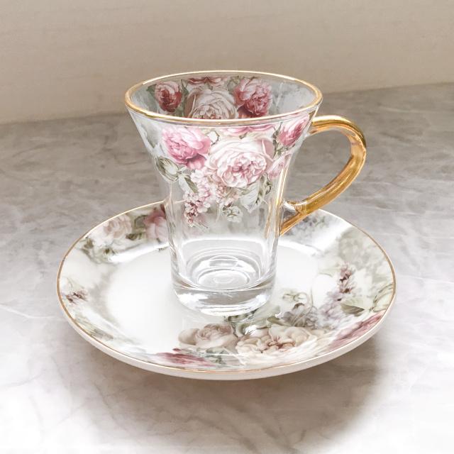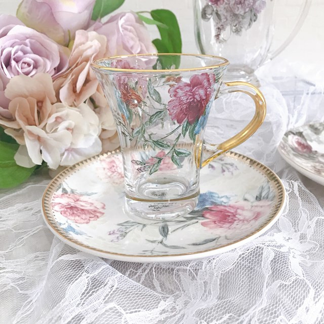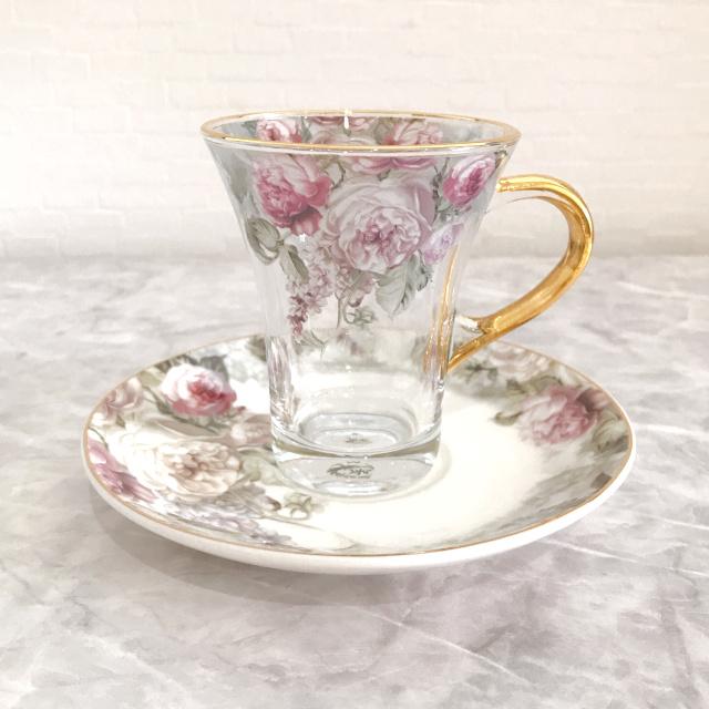 美しい薔薇の花が描かれたお洒落なガラスのティーカップと陶器のソーサーセット。