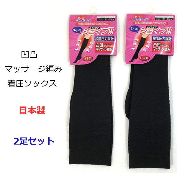 上質 日本製 着圧ソックス【2足セット】 凸凹マッサージ編み 黒無地 ハイソックス むくみとり