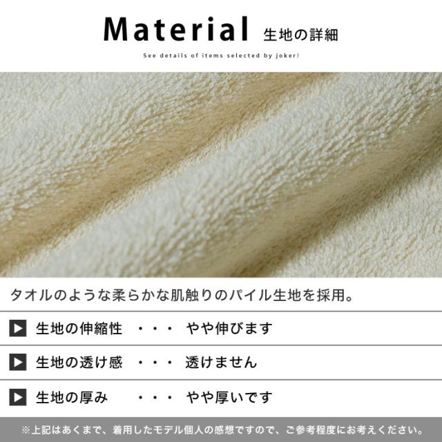 少しゆとりのあるサイズ感でした。両面がパイル素材でできており、柔らかな肌触りがとても気持ち良かったです。体の大きな方でも窮屈感なく着用することができるので良いですね!
