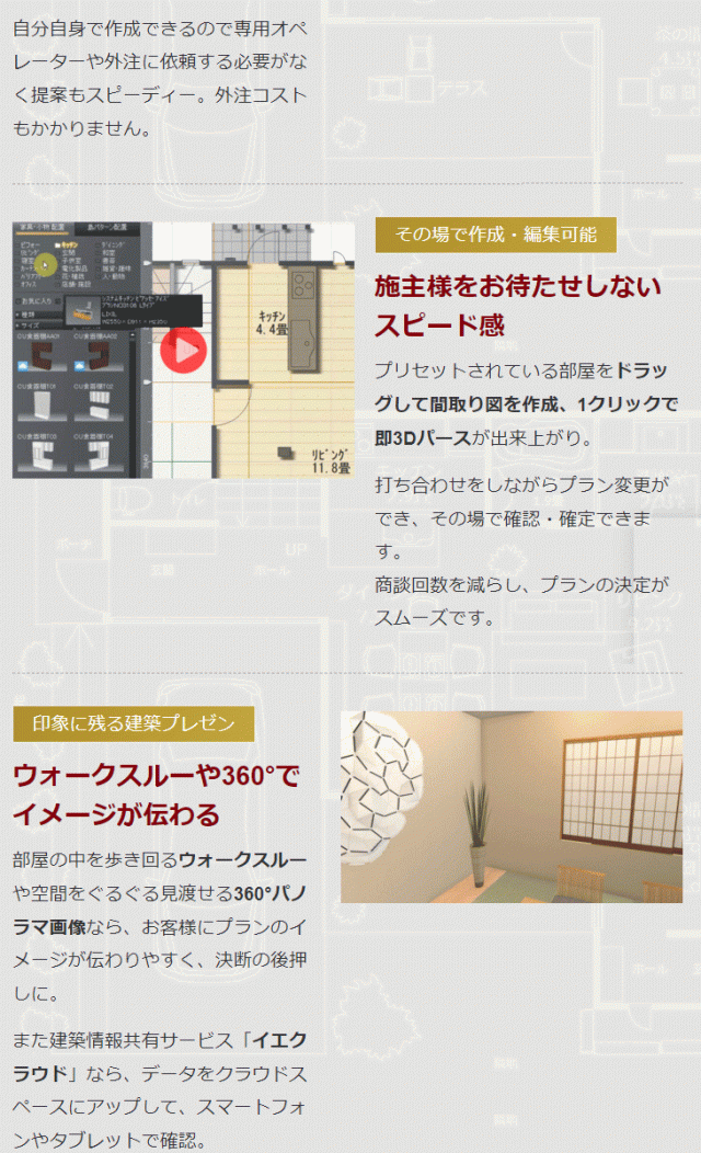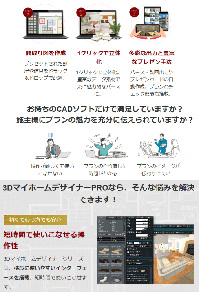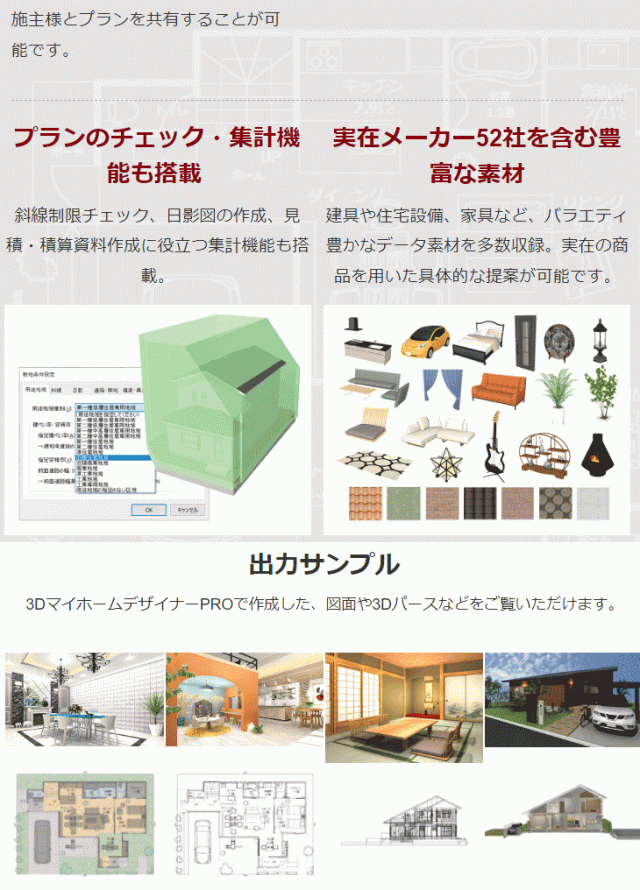「間取りプラン」「3Dパース」「プレゼンボード」などのプレゼン資料を作成できる、新築戸建てのプラン作成建築デザインソフト