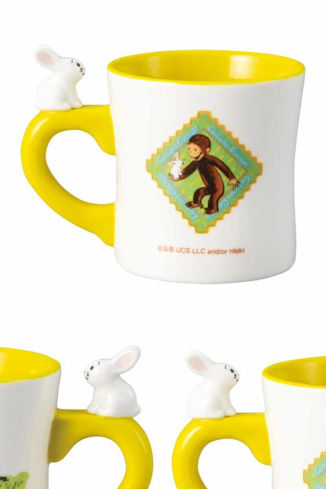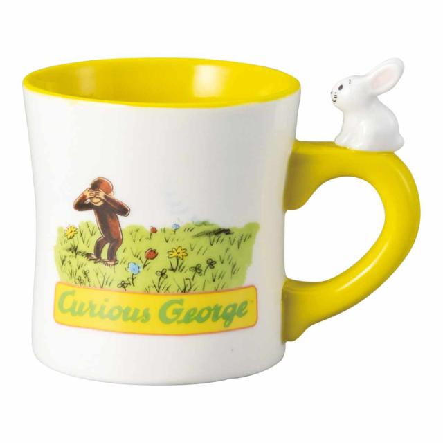 取っ手の上にはうさぎさんのマスコットが乗っていてティータイムをより和ませてくれそうです。裏面にはうさぎさんを見つけてにっこり笑っているジョージのイラストが描かれています。持ちやすい取っ手付きで日常でも使いやすく、ちょっとしたプレゼントにもおすすめです。