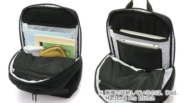 B4サイズに対応したメインルームで、ビジネスに欠かせないPCやタブレットの収納に特化した内装が魅力。2つの収納部はそれぞれクッション性を高めた素材を使用し、デバイス機器を安全に管理できます。さらに、伸縮性のあるメッシュ素材を使用したジップポケットも完備した、実用性の高いつくりになっています。