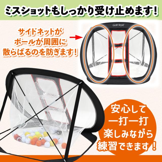 【安定感抜群のアプローチネット】ボールをたくさん入れても倒れにくい構造で、効率的に練習ができます。的から外れてしまっても大きなサイドネットがボールの散乱を防ぎます。