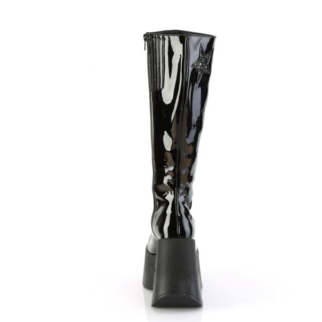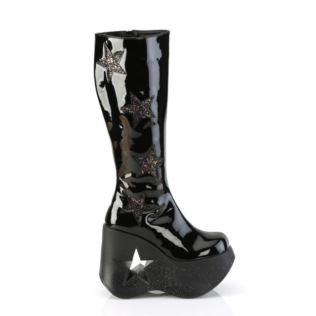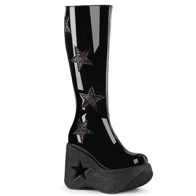 Demonia(デモニア) DYNAMITE-218 星形カットアウト ウェッジソール 厚底ニーハイブーツ エナメル黒◆取り寄せ