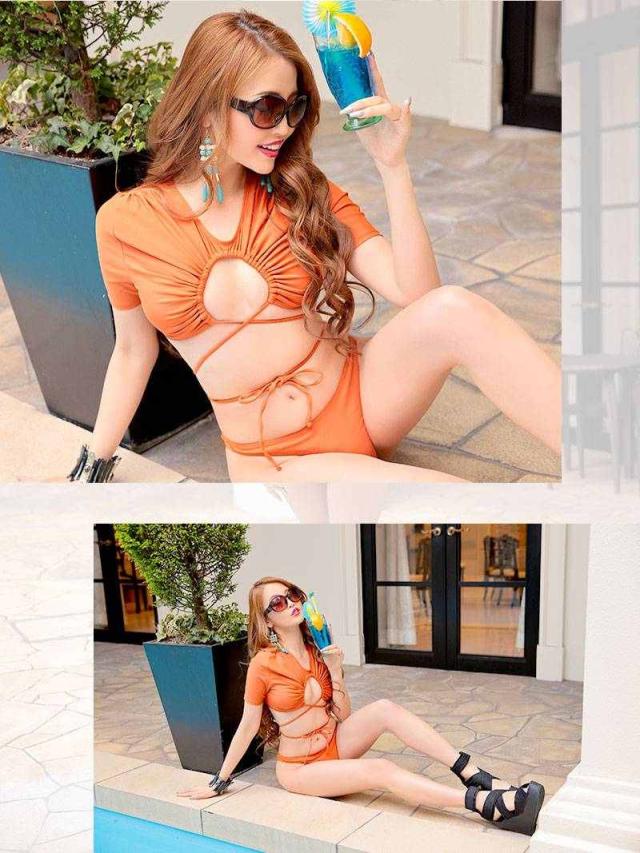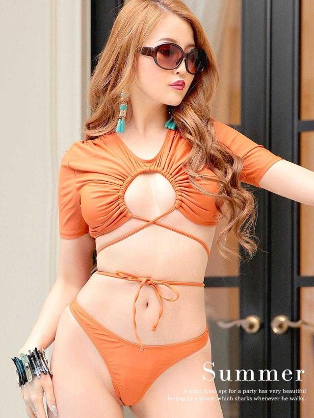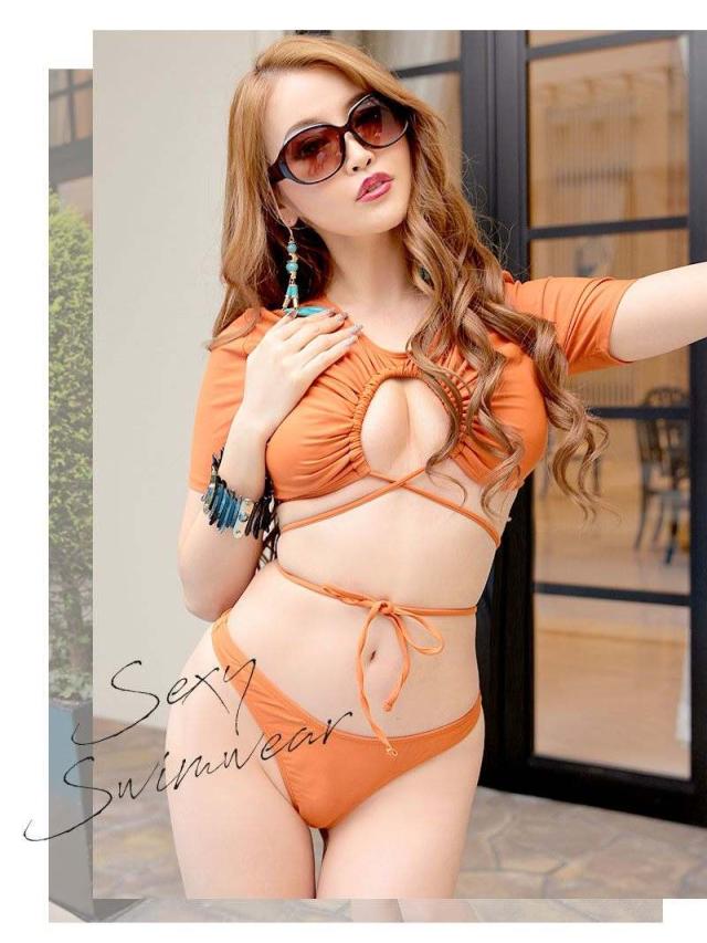 ☆紐でアンダーを調整でき、ウエストのくびれを作るレディースビキニは二の腕をカバーしてくれる袖付きビキニ♪