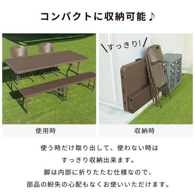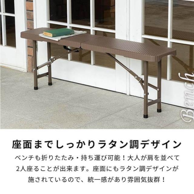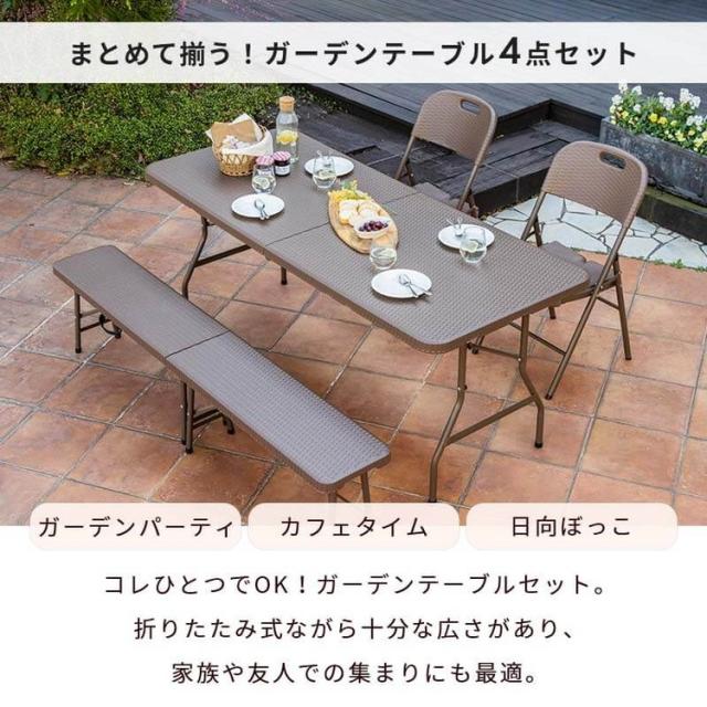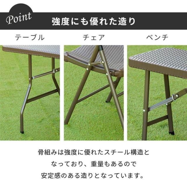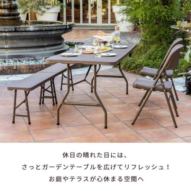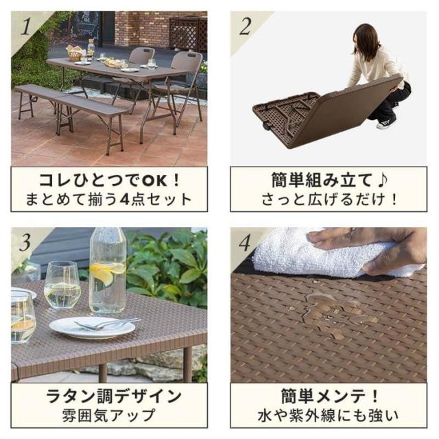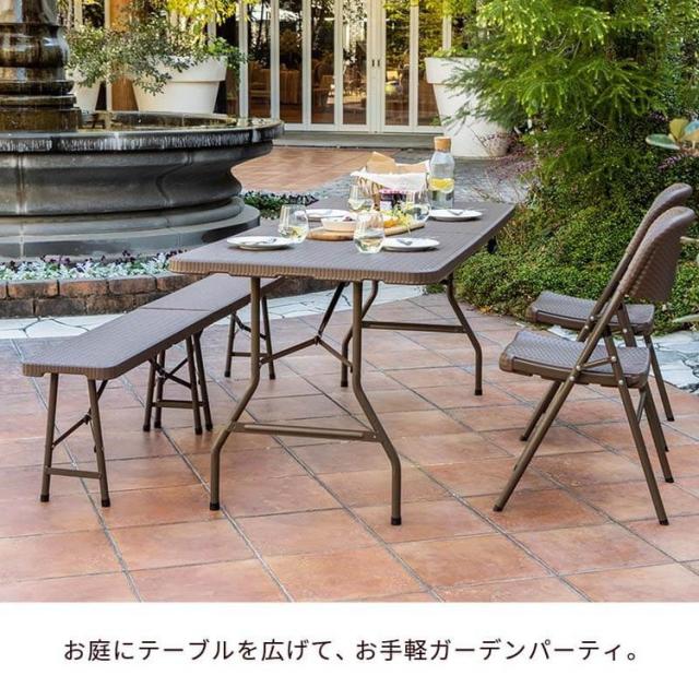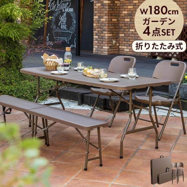 ラタン調 折りたたみ ガーデン 4点セット マカティ 幅180cm 折りたたみテーブル 折りたたみチェア ベンチ セット 屋外 テーブル アウトドアチェア 折り畳み コンパクト ガーデンファニチャー(代引不可)【送料無料】