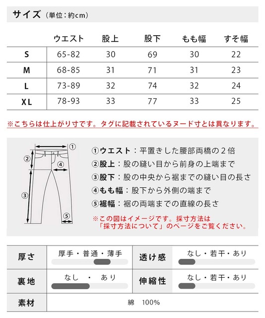 | サイズ | ウエスト | 股上 | 股下 | もも幅 | 裾幅 |