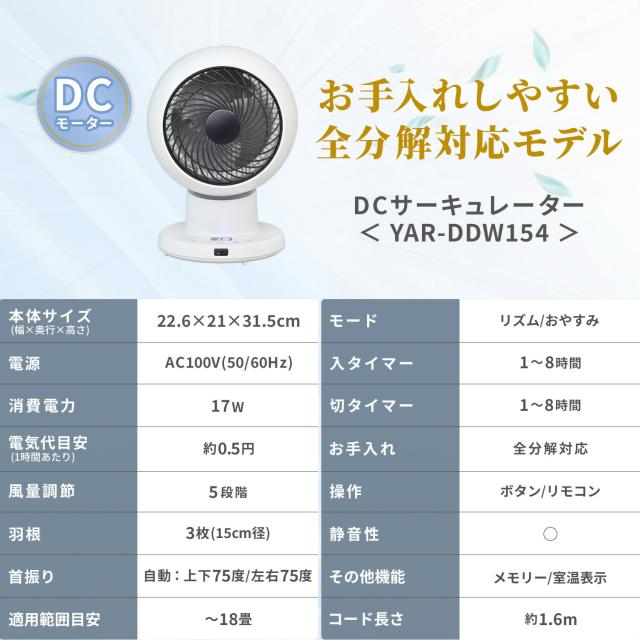洗える サーキュレーター DCモーター 全分解サーキュレーター 上下左右首振り 18畳まで DCサーキュレーター 静音 分解できる YAR-DDW154(W) 分解 扇風機 上下左右首ふり お手入れ簡単 おしゃれ 山善 YAMAZEN 【送料無料】