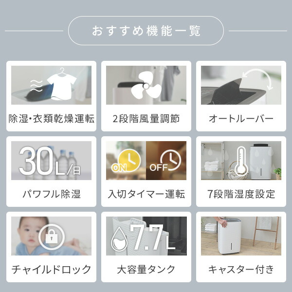 | 商品説明 | ●電源:AC100V(50Hz/60Hz) ●消費電力(50/60Hz):535/610W ●除湿能力(50/60Hz):1日27L/30L ●除湿面積の目安(50/60Hz):(集合住宅)68/76畳、(プレハブ)52/58畳、(木造)34/38畳 ●水タンク容量:7.7L ●電源コード長さ:約1.7m ●入/切タイマー:1-8時間 ●24時間オートオフ機能搭載 ●風量2段階:弱・強 ●モード切替:除湿・送風・乾燥の3モード搭載 ●スイングルーバーで自動で上下(30-80度)に動きます。ルーバーは手動で固定する事も可能 ●湿度設定は40-70%の範囲から5%単位で細かく設定できます(除湿運転時) ●連続排水対応:付属の排水口アダプターと排水ホースを取り付けることで可能 ●チャイルドロック搭載 ●移動に楽なキャスター付き ●メーカー保証1年付き ※こちらの商品は2025年2月に型番変更をしております ・型番:YDC-E300→YDC-E301 |