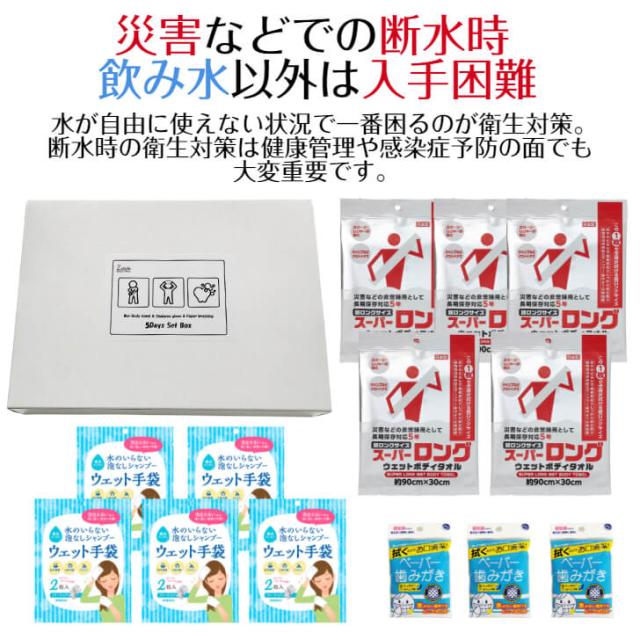 防災備蓄用 衛生用品 災害断水時 衛生用品 5日分セット 防災セット 防災グッズ 防災用品 避難セット 避難グッズ シャンプー手袋 体拭き ペーパー歯磨き 衛生用品 衛生グッズ 断水時 ボディケア用品