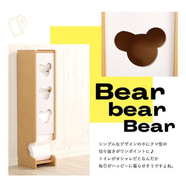 生活感を抑えるペーパー収納。カラーバリエーションは、ホワイト(JAN:4535306181369/品番:SH-12-BSTR--WH)、ナチュラル(JAN:4535306181376/品番:SH-12-BSTR--NA)です。シンプルなデザインの中にクマ型の切り抜きがワンポイントに♪トイレットペーパーは最大約5個収納可能!!奥行わずか14.5cmの薄型デザイン。トイレの限られたスペースにもすっきり収まります。フタつきで衛生的!安心の日本製,軽くて組み立ても簡単。