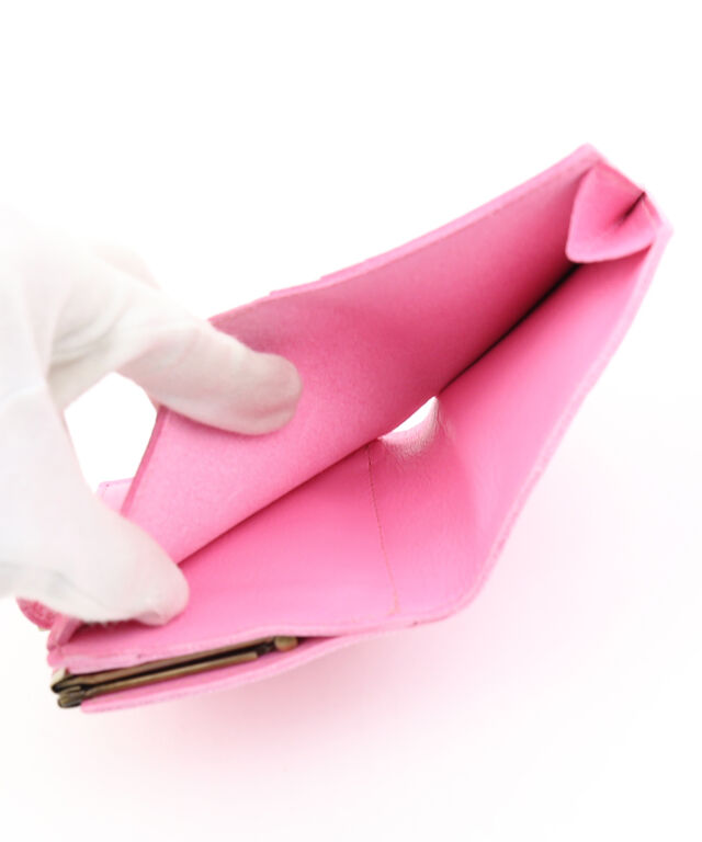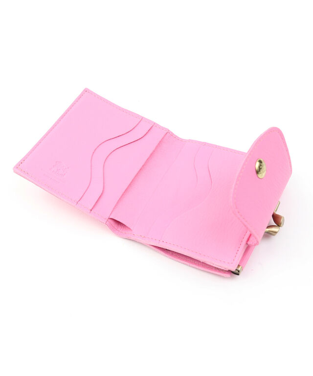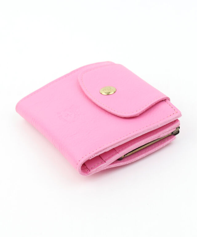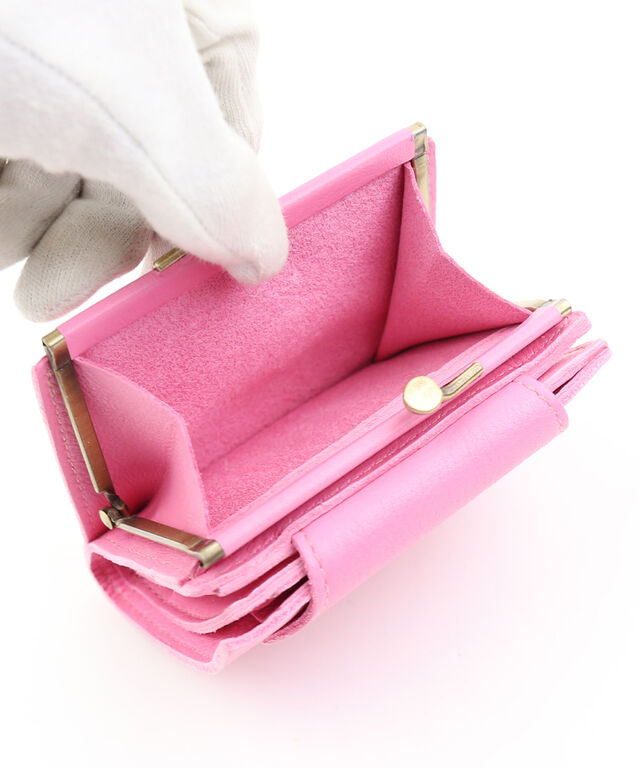 がま口開閉のコインポケットが付いた二つ折り財布。