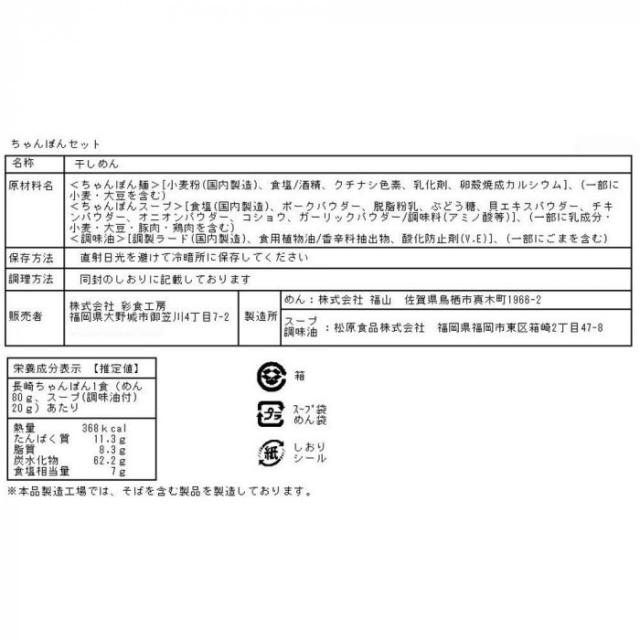 商品詳細:生麺をそのまま48時間熟成乾燥させうま味を凝縮させたノンフライの旨麺に、じっくり煮込んだ豚骨ベースの長崎ちゃんぽんスープをセットしました。 生産国:日本 内容量:ちゃんぽん麺80g×10、長崎ちゃんぽんスープ20g×10 賞味期間:300日