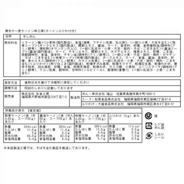 商品詳細:小麦の生産高全国2位の福岡県が5年の歳月を掛けて開発したラーメン専用小麦「ラー麦」を100%使用した麺!コシのある食感と滑らかなのど越し、淡黄で明るい麺が特徴です。 生産国:日本 内容量:ラー麦麺80g×4、はかた大将豚骨スープ35g×2、はかた大将醤油スープ35g×1、はかた大将味噌スープ35g×1、ラーメンふりかけ3g×4 賞味期間:300日