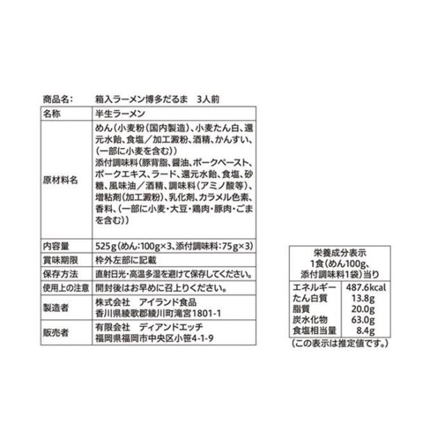 商品詳細:超濃厚『博多だるま』。 生産国:日本 内容量:1箱あたり:麺100g×3・スープ75g×3 仕様:常温保存賞味期限:受注後製造日より90日(受注生産品) セット内容:10箱