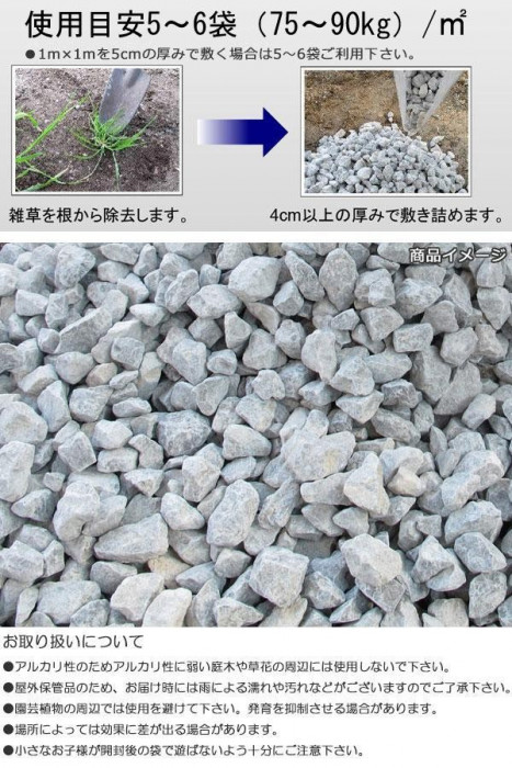 商品詳細:国内産天然石を砕いた自然素材の敷砂利です。車が踏むたびにしっかり締まるような粒度に配合されています。石質が固く車の重量にもよく耐えます。また、アルカリ性を帯びているため雑草の成長を抑制します。薬剤不使用。周辺環境に優しい駐車場向けの砂利です。 生産国:日本(滋賀県) 素材・材質:砕石(自然石) 内容量:1袋あたり:約15kg 仕様:粒目:約1.3~2.0cm セット内容:8袋セット